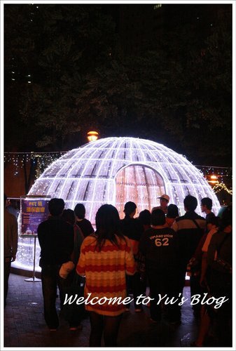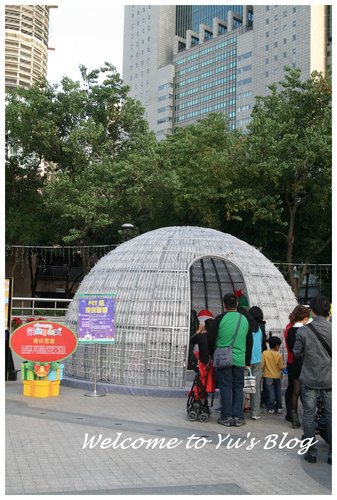 往廣場前進看到排隊進入環保雪屋的人潮更多了