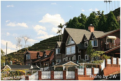 我們隨意走在潭邊發現有一棟很有歐洲特色特色的民宿,潭的四周除了一些住宅外全為茶園,還有整齊排列在潭邊山麓的梯田遍植烏龍茶樹,此時我突然想來杯烏龍茶,不過沿途只有7-11我們買了2罐烏龍茶,搭配著我們上次從金門買回來牛肉乾,就這樣開懷的吃著、喝著,並準備往一站出發了!