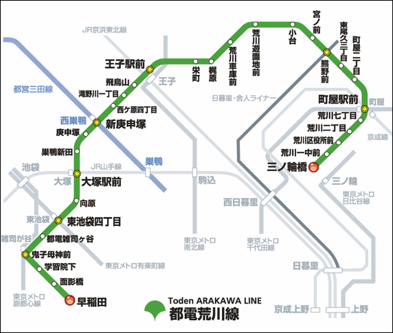 「荒川遊園地」、「荒川車庫」、「雑司ヶ谷霊園」、「鬼子母神」等名所,