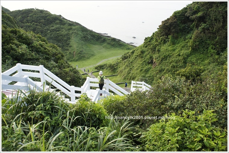 V字型翠綠的山谷,起伏有致與深藍的海水,