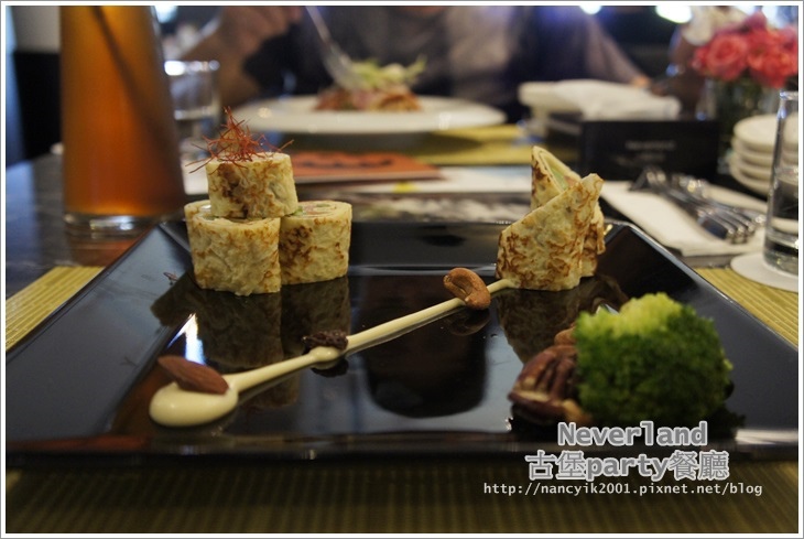 蛋皮內除了包裹鮭魚外還有蘆筍,是很爽口的一道餐點,