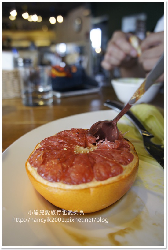 一旁配菜除了烤過筊白筍外還有葡萄柚, 這樣的吃法我還第一次嚐試,