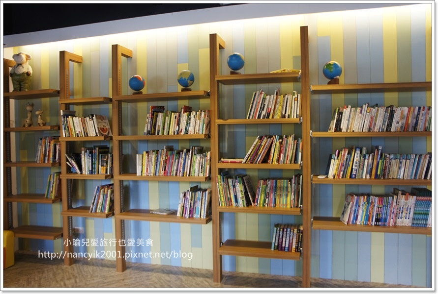 進入親子閱覽遊樂室需拖鞋, 裡頭主要提供益智學習類的玩具, 最吸引我的自然就是這個大書櫃 ,