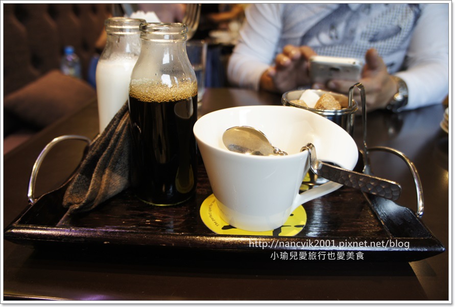 這樣才不會燙著啦!! 除了很有特色的杯子外, 一旁那兩個瓶子裝的是黑咖啡和鮮奶,