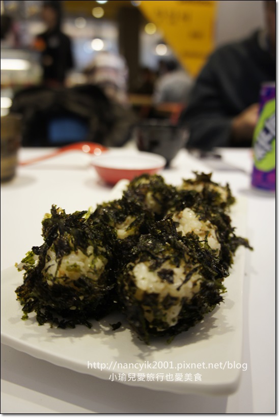 內餡包入少許牛肉的飯團,外面則是灑上香鹹脆口的海苔另外還有附上沾醬,