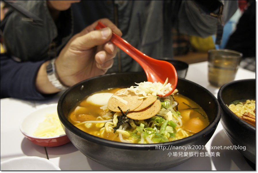 部隊鍋結合了韓國拉麵,除了一般配料還添加了各式香腸等,這一碗年糕也不少,