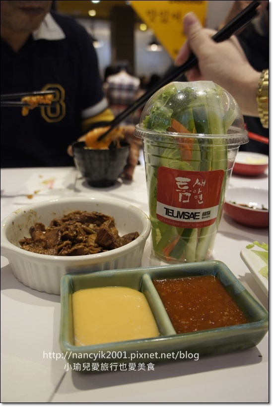 一旁的蔬菜棒也可以搭上另一種沾醬, 我是覺得肉片可以再多一些,