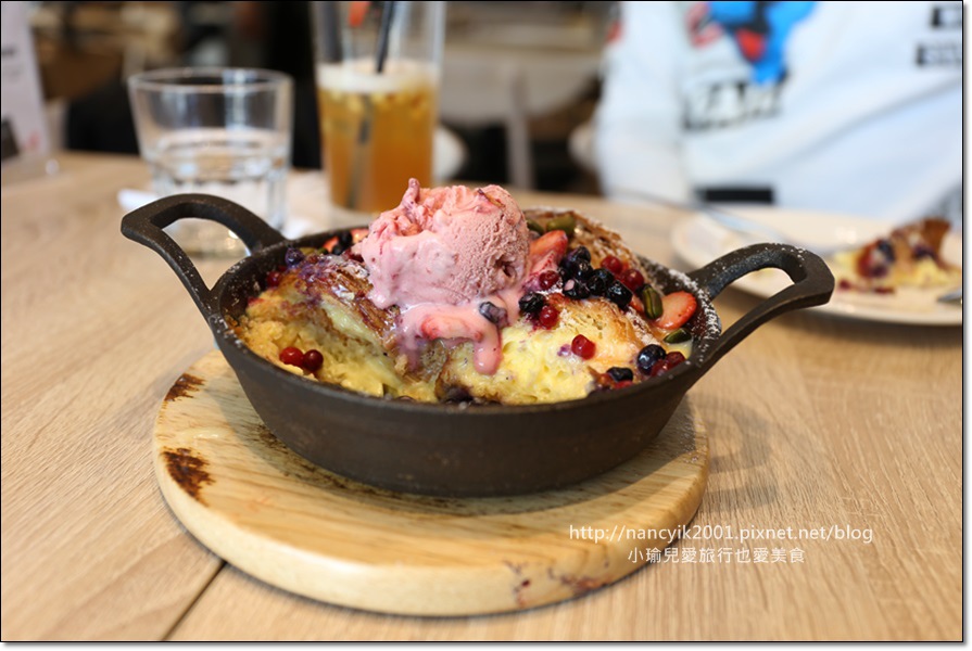 上面除了有草莓切片還有冰淇淋以及四周的莓果,讓這道甜點吃起來酸酸甜甜的。