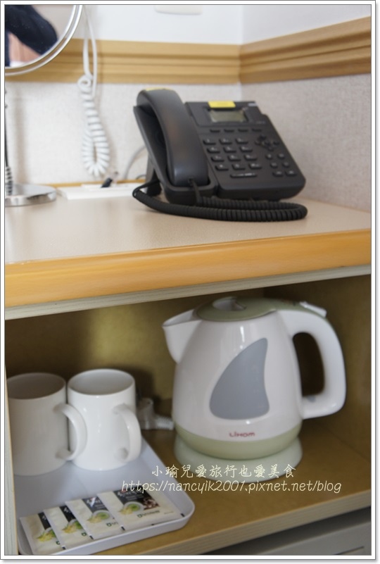 床的旁邊有張桌子,一旁有電話 保險櫃 吹風機.....等。