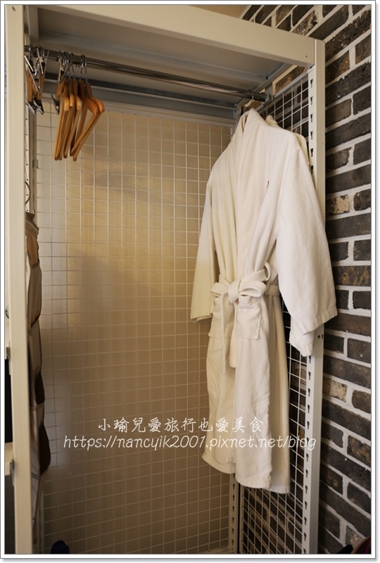 開放式的衣櫃上掛著浴袍,而且還提供超多的衣架 。