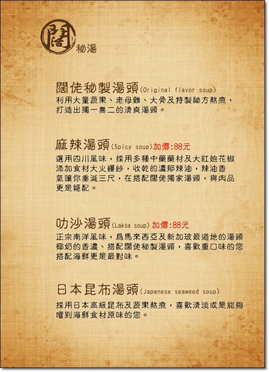 麻辣湯頭 (+88元)和叻沙湯頭 (+88元) 四種可供選擇。