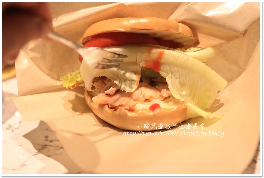 貝果餡有燻雞、生菜、番茄、玉米粒佐以番茄醬,
