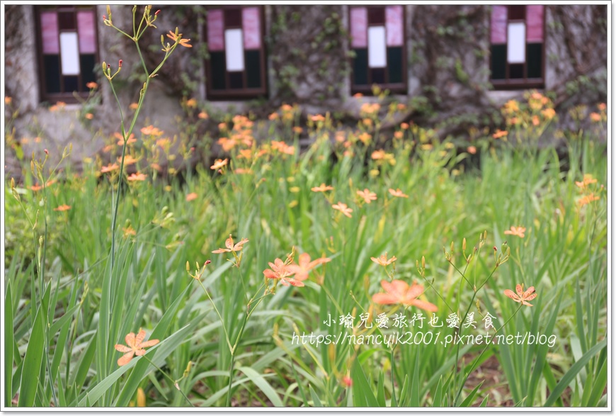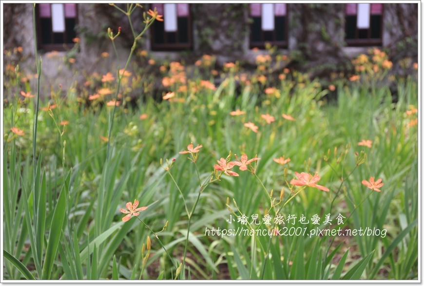 而前方空地有著盛開俗稱尾蝶花的射干,
