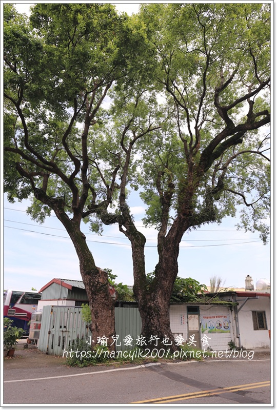 【新城天主堂】入口對面馬路旁有兩棵相連的百年老樟樹,