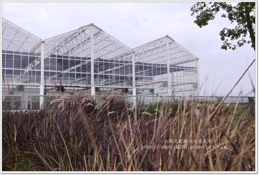 玻璃屋溫室前紫夢狼尾草隨風飄逸著,