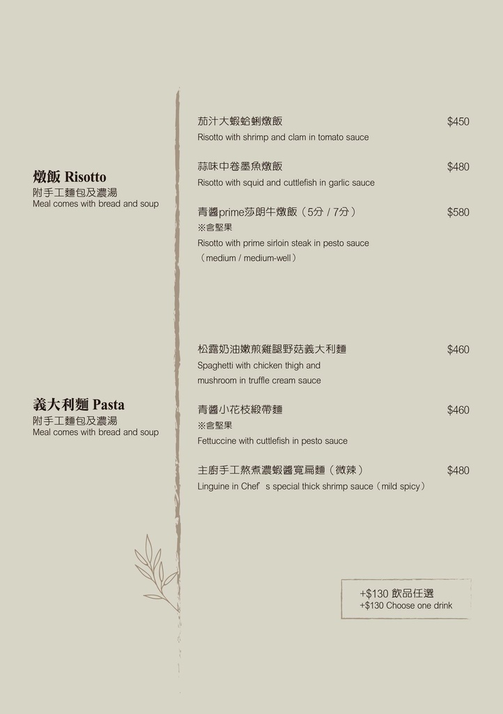 有燉飯、義大利麵、披薩、炸物、甜點、咖啡....等,