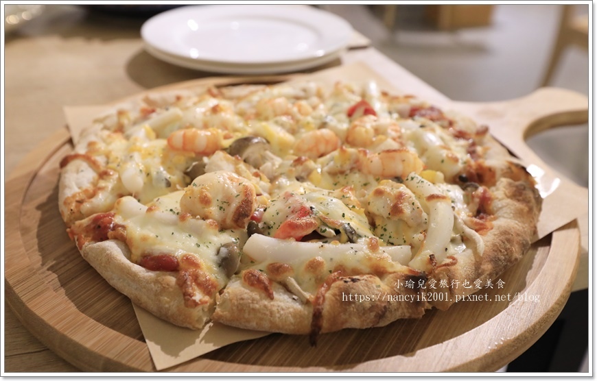 有不少的蝦子和花枝以及滿滿的起司,