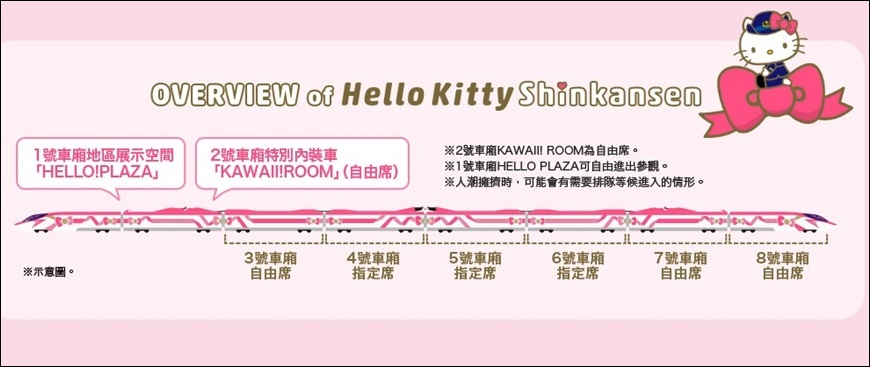 【Hello Kitty新幹線列車】共有8節車廂,