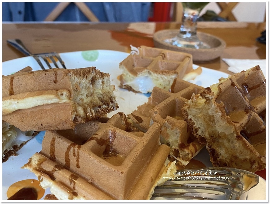 格子鬆餅內加入麻糬,口感更Q彈有著外酥內軟的口感,