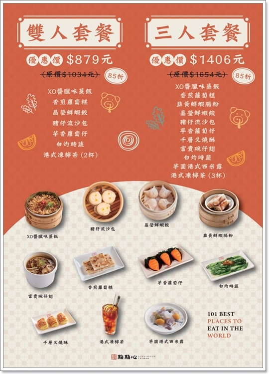 XO醬臘味蒸飯、香煎蘿蔔糕、晶瑩鮮蝦餃、豬仔流沙包、芋香蘿蔔仔、